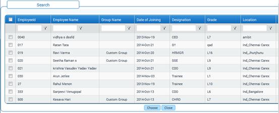 Employee list in this field is populated on two scenarios. 1. On selecting a Group Name, employees available in the selected Group is populated in this field. 2. On selecting employees by clicking [Search] button, if any employee is not a member of any other Group, then those names are also listed here, in addition to the existing employees. |
