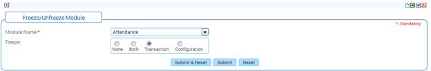 Once the configuration of module wise freeze/unfreeze is setup, it will impact the configuration and transaction forms of the selected modules. For example if Attendance module is set in freeze mode for Transactions, then the Transaction forms belonging to Attendance module like Attendance Regularization will be in freeze mode i.e. Submit button will not be available.
