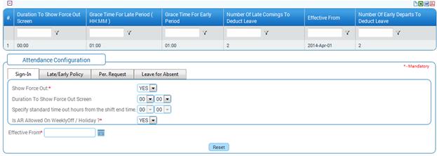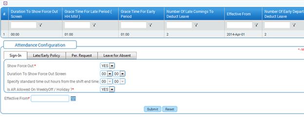 Once the configuration is set up for the module, the configuration can be in freeze mode and the transaction form can be enabled for transactions to happen. For example, if Attendance module is set in freeze mode for Configuration, then the configuration forms belonging to Attendance module like Attendance Configuration will be in freeze mode i.e. Submit button will not be available.